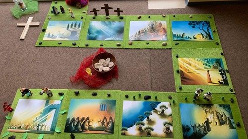 Mit Hilfe von Legematerial und biblischen Puppen wurde die Ostergeschichte und Jesus Weg erarbeitet, erzählt und nachgespielt.