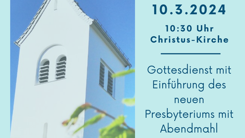 Im Gottesdienst am 10.3.24 werden wird das neue Presbyterium eingeführt. Herzliche Einladung an Sie, dabei zu sein!