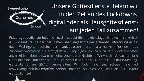 Präsenzgottesdienste holen wir nach, sobald die Infektionslage nicht mehr so kritisch ist. Wir sind traurig darüber, halten aber angesichts der aktuellen Entwicklung es für das Wichtigste, aufeinander aufzupassen und alternative Formen des Zusammenkommens zu ermöglichen. Diejenigen, die sich zu den Gottesdiensten angemeldet haben, bekommen eine gesonderte Nachricht. Wir werden Andachten und Gottesdienste aufzeichnen und veröffentlichen aber auch ein Online-Meeting-Gottesdienst am 25.12. veranstalten. Wir laden Sie ein, melden Sie sich an, schauen Sie unsere Gottesdienste!