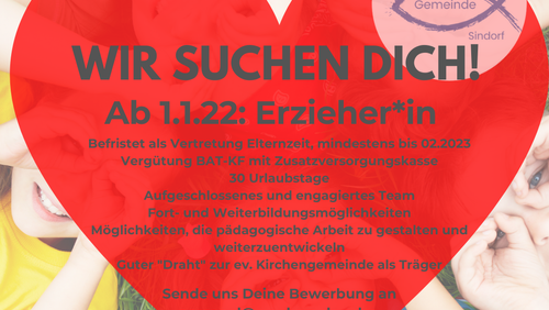Wir freuen uns über Ihre Bewerbung. Kirchengemeinde Sindorf, Verwaltung: Andreaskirchplatz 1, 50321 Brühl. Mail: personal@evv-ksm.de. Nähere Auskunft erhalten Sie bei der Leiterin der Kindertagesstätte, Frau Löffler (Tel. 02273 52417, Augsburger Str. 21, 50170 Kerpen-Sindorf.